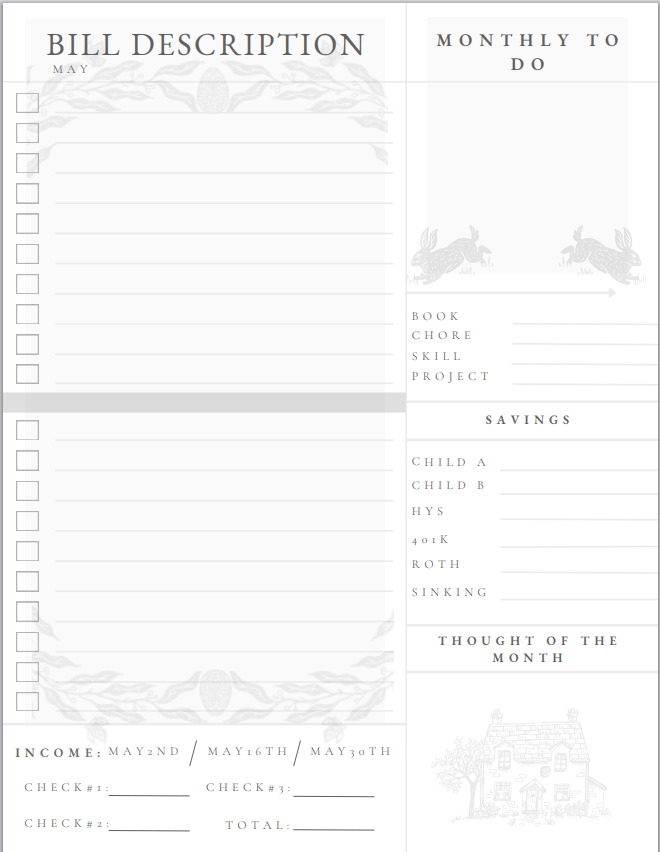 I have included a savings area, which is modifiable to fit your needs. I treat saving as a biweekly bill so that I ensure something, no matter how small, goes into savings. When building this print out I tried to incorporate the typical saving strategies used by most people but these are not exactly what I use. I personally have a HYS account for each of my children, and an emergency/savings fund. I do not use a traditional bank for savings, there is zero growth to putting savings in a radiational account. A HYS account, while the rate fluctuates will have always bring you some growth. Each child gets a set amount into savings every two weeks, the emergency fund is dependent on what is left over from the budget. Again, my savings – especially for my children, become a routine bill. I have a 401B through work, but since that money is taken directly out of my check I don’t include it in my budget. (I plan to create a wealth tracker print out/spreadsheet where you will be able to track things such as 401k, Roth, house value, ect.) I also have a very small Roth, which I don’t regularly contribute to so I don’t track it on my monthly budget. In the future I plan to contribute more to a Roth but at this time my savings goals are very specific – I want a farm, and have to save for a down payment on that, so all extra savings, beyond my kids, are going into a HYS specifically for that goal.